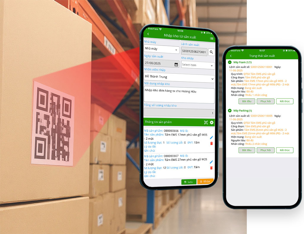 - Cập nhật kết quả của từng công đoạn vào hệ thống, có thể dụng QR Code và App.
